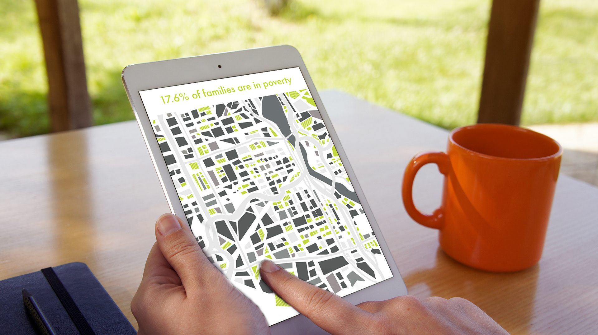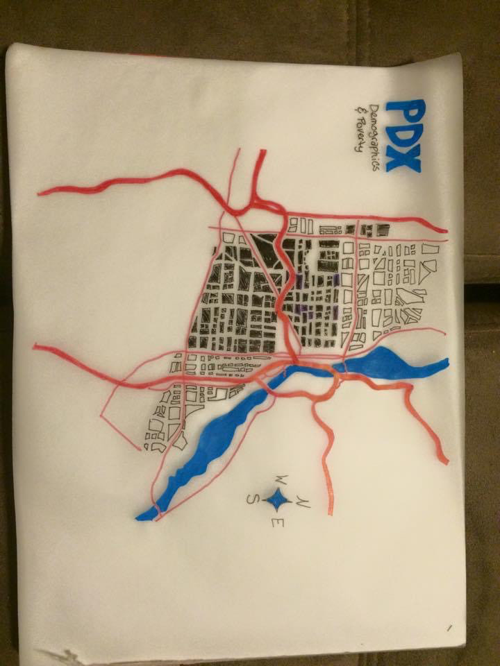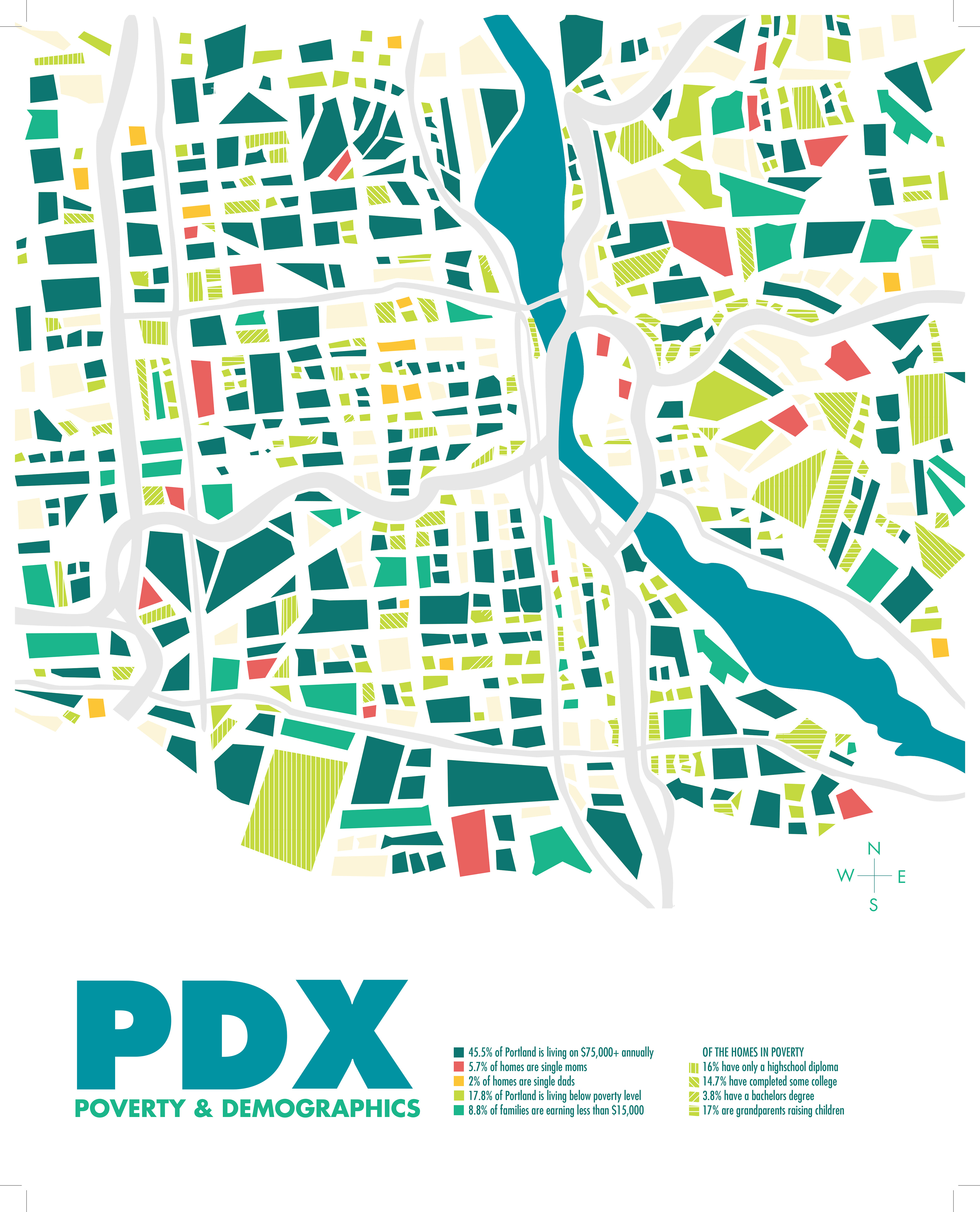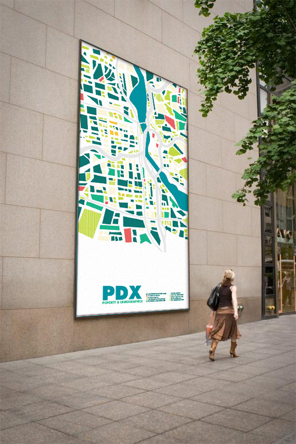 This info-graphic shows the details of Portland’s poverty issues. The geometric shapes of this are made with sharp angles and look like broken glass that represents how broken our community truly is.